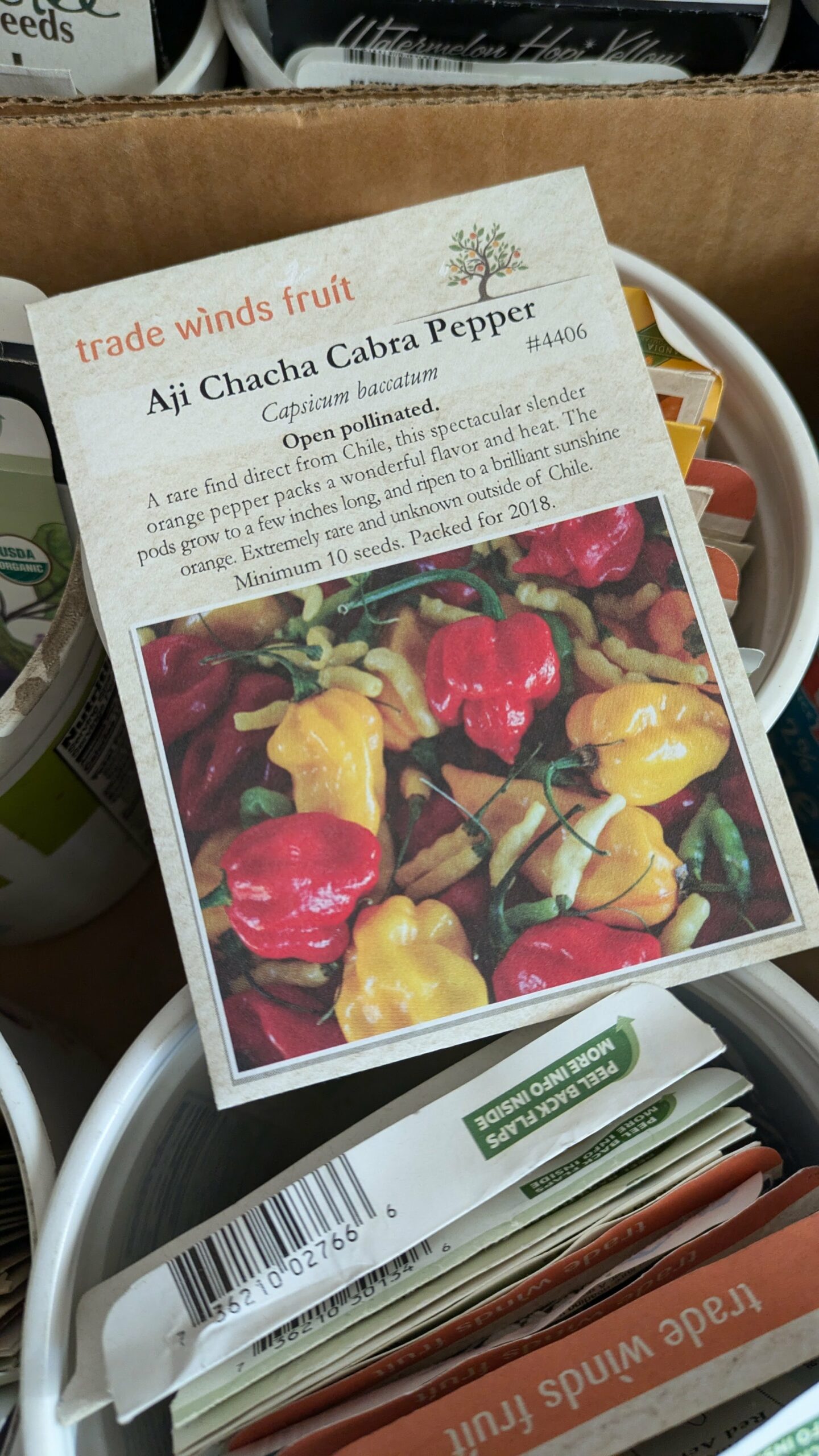 | Trade Winds Fruit | Aji (Peruvian) peppers, other peppers, maize | Rare seeds; average packet is $2.50 |