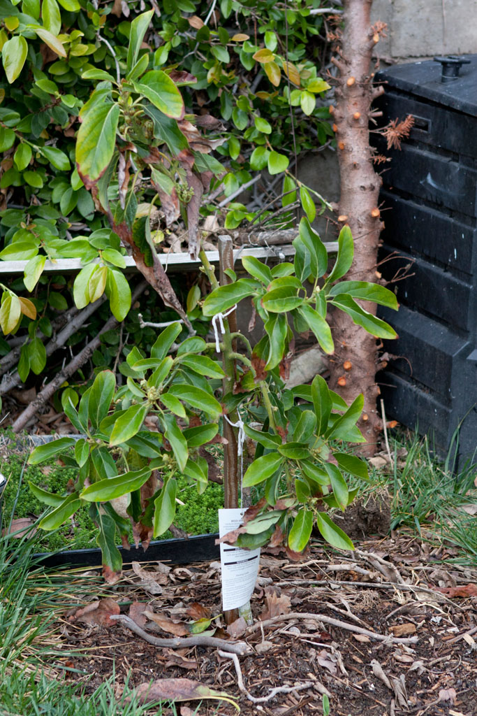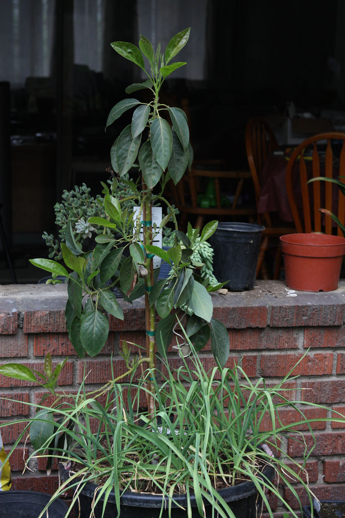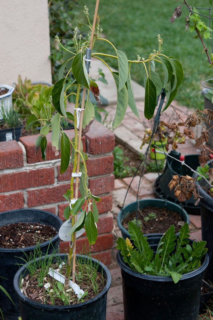 This Gwen avocado (Persea americana) was purchased online. The seller labels this as an “one year old tree.” They do not expect their trees to fruit until they reach three years. Surprisingly, it is setting out blossoms. To let the tree concentrate its energy towards growth, I nipped all the buds off. The Gwen avocado is a Hass type avocado. I am quite fond of the Hass variety. The hard skin makes it easy to get the fruit off. It is also richer and creamer than other varieties.