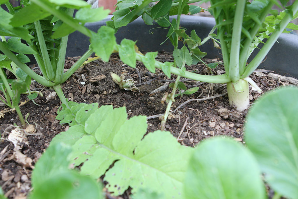 The tale of two radishes: The daikon radish has a leaf that runs along the soil. Not wanting the leaf to block the sun out, I removed it from one of the radishes. The one with the leaf removed is now growing out of the ground. I wonder if the leaf causes the radish to stay under the soil. The next radishes planted will make for a good experiment.