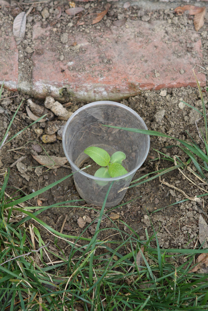 This Apollo’s Fire sunflower is taking the place of a Red Sun sunflower that was mowed down by slugs. To provide it with protection, a used plastic cup is installed along with.