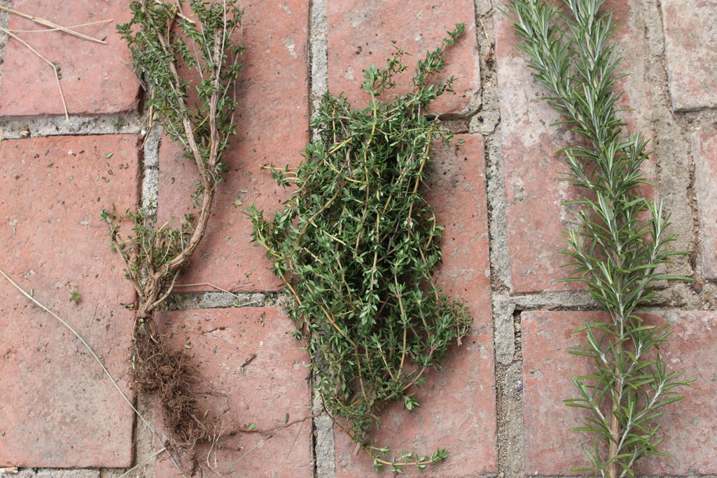 Thyme might be the most practical herb. It grows easily, grows year round, and can be used to season many types of dishes. Thyme sows itself and after letting it grow, I yanked it out. With the bareroot, I am moving it to a more suitable location. On the far right is rosemary. Like thyme, it grows year round. They both make good ornamental plants that can be harvested for cooking. Cheap, convenient, and fresh.