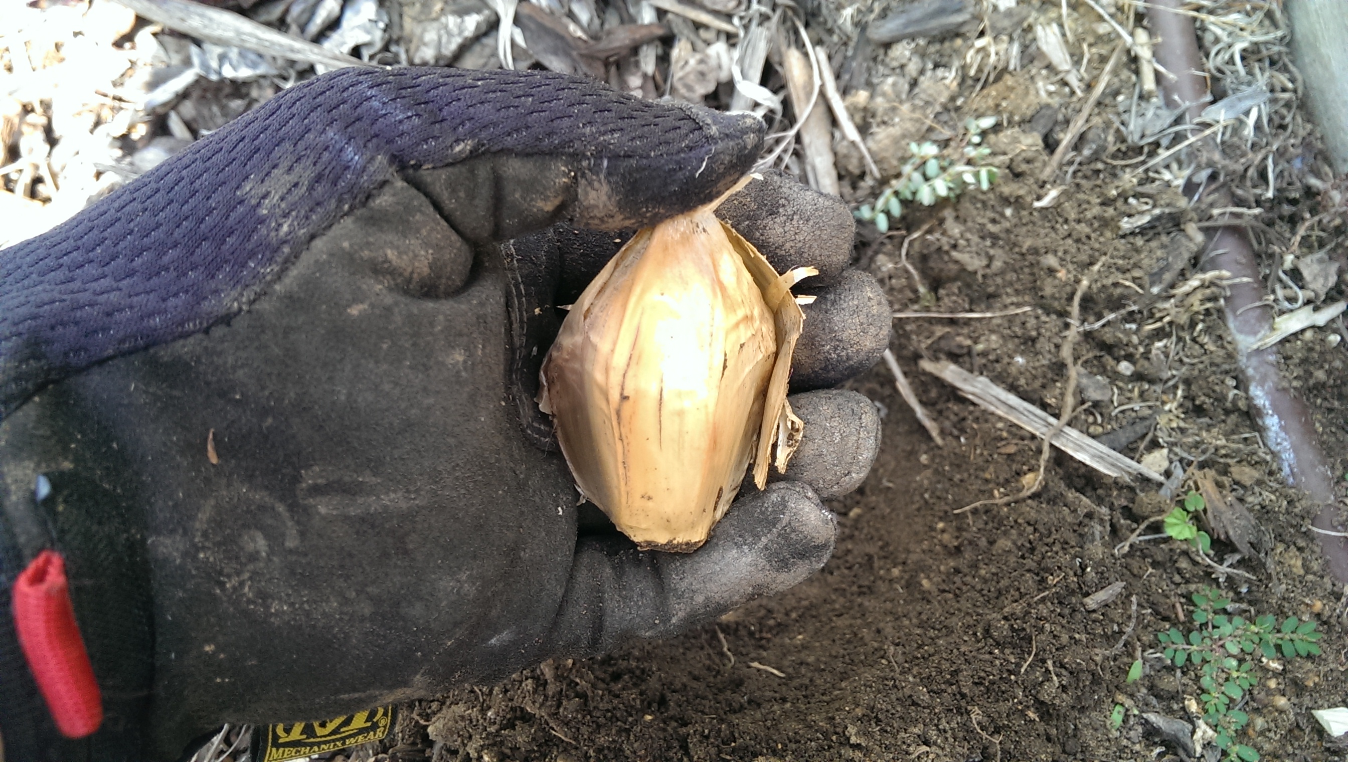 Today, the elephant garlic were planted in the Front Garden. Elephant garlic (allium ampeloprasum) are easy to grow. When planting, they are normally planted without much effort; and given little care. A small hole is dug and they are placed in. The soil in the front of the house (or Front Garden) is worked minimally. Despite the soil being closer to dirt, the bulbs produced at the end of the season are good sized.