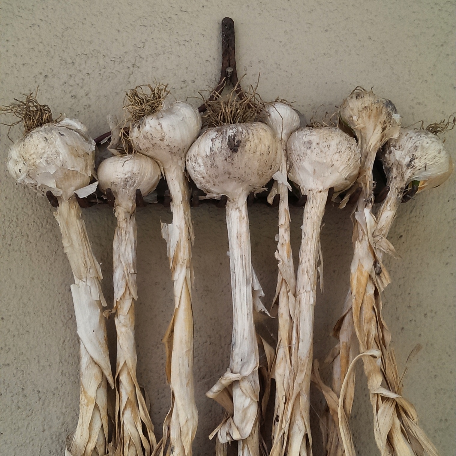 The elephant garlic from this year’s harvest are loaded onto a bow rake and cured.