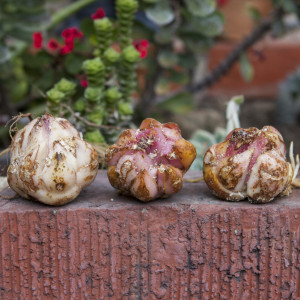 Unpacking the three lily flower color/pattern types, it was interesting to find that the bulb color is reflective of the flower color. In the below picture of the three bulbs (from left to right) the corresponding variety is: Casablanca, Stargazer, Pico.