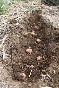 ‘Forest pansy’ redbud sticks are used as markers. It is difficult to remember where what is planted without marking or mapping their location. Nothing is more painful than digging in the soil and discovering a bulb/tuber/rhizome freshly chopped in half.