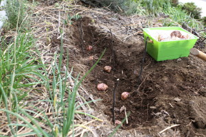 As for the location of planting, the Front Garden was the first choice. It is a sunny and proven location. During this exercise, a Russian sage and dahlia tubers had to be relocated (not pictured). Once moved, six Stargazer lily bulbs were planted in a row in front of the garlic chive and ‘red Creole’ onions. In terms of permaculture design, planting in front will mask the garlic chive and onion; giving it less of a vegetable garden look.