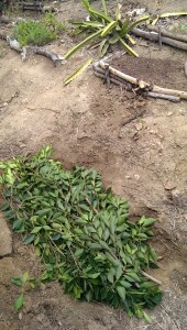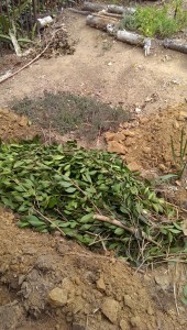 There is quite a bit of green waste from the weeping fig to find a place for. Its waxy and fibrous leaves take a while to break down and often it is first to be sent off. Today, there was time to keep them onsite. In the Resort garden on the ground where it is unlikely to be worked any time soon is where some of the green waste is going. Out comes the drain shovel and the gloves.
