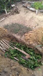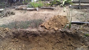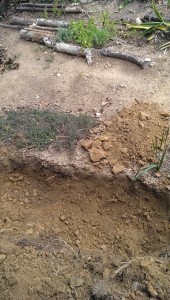 Due to the micro-climate, sun loving crops do not do well here. The green patch of oregano and thyme is a living artifact of where I first tried to establish a garden on this property. I thought about laying a hugelbed over the patch but then I would lose my artifact; something I am not ready to do yet. Instead, I dug a hole adjacent to it.