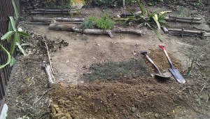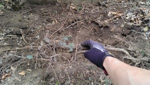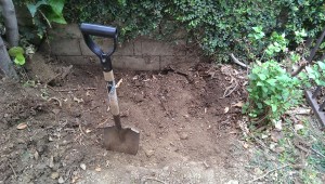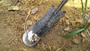 Lots more digging. I worried about putting too much strain on my right shoulder. With the opportunity to get lots of work done, I went on and hoped that an injury is not sustained. The area between the holly (on the left) and the French lilac gets mostly shade– making it not a very productive site. I decided this is the spot for a tertiary compost area. I begin to dig out a few inches of dirt.