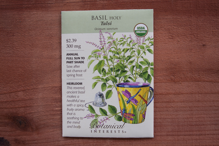 Holy Basil (Tulsi). There are four types of holy basil. This is the first Tulsi offering by Botanical Interests; and I am planting these out of curiosity as to what type they are putting in their seed packets. It is difficult to guess from the illustration. Its identity will be revealed soon enough.