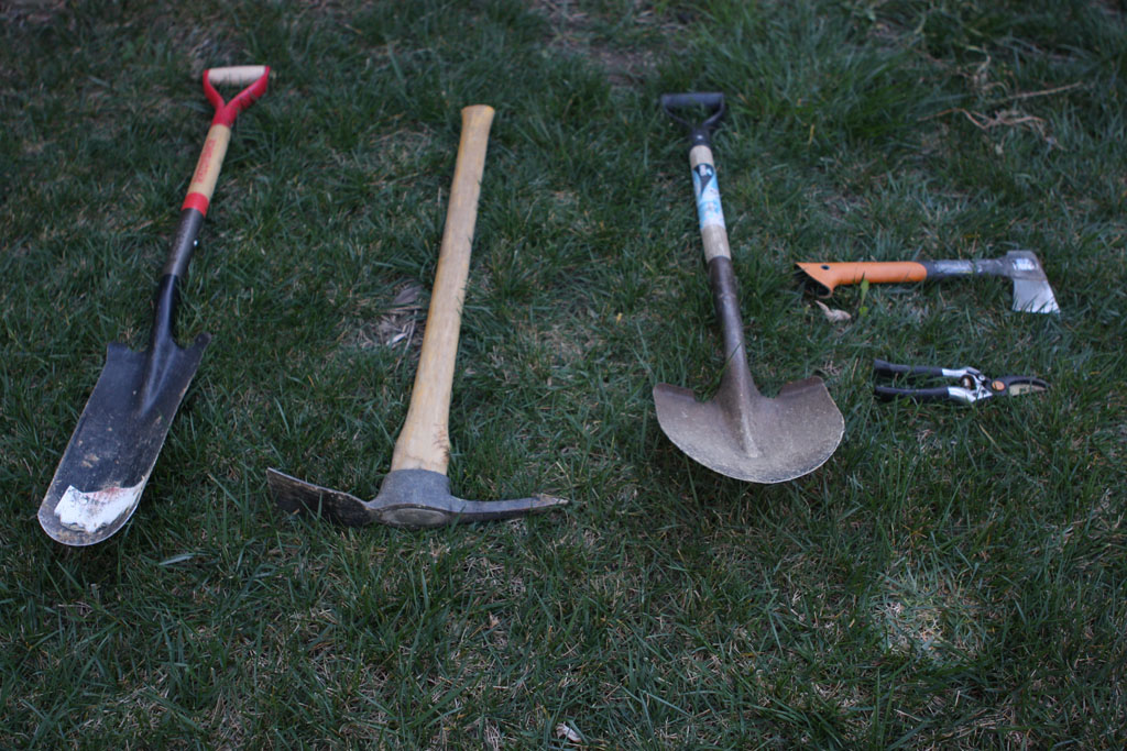 Tools to get the job done. (L-R) Trench shovel, pick mattock, spade shovel, hatchet, bypass pruner